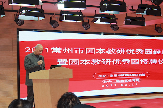 在新北区教育局副局长杨仁元开场致辞后,由常州市教科院副院长潘小福为大家宣读获奖名单并表示祝贺。在授牌仪式中,我们一起见证了10所“常州市园本教研优秀示范园”和18所“常州市园本教研优秀园”的傲人风采。
