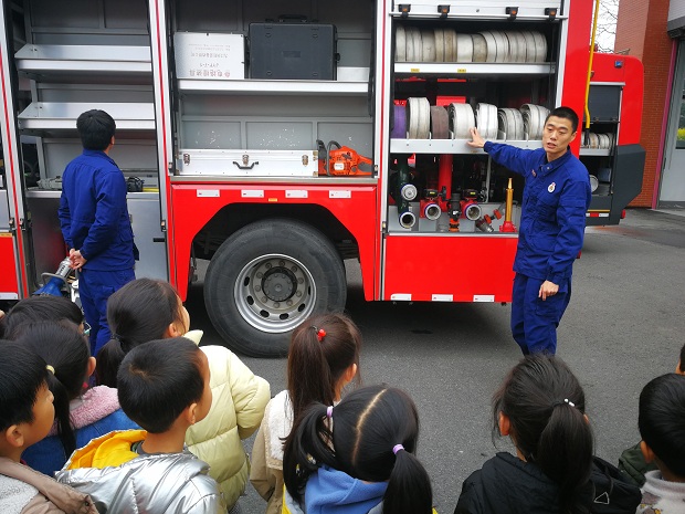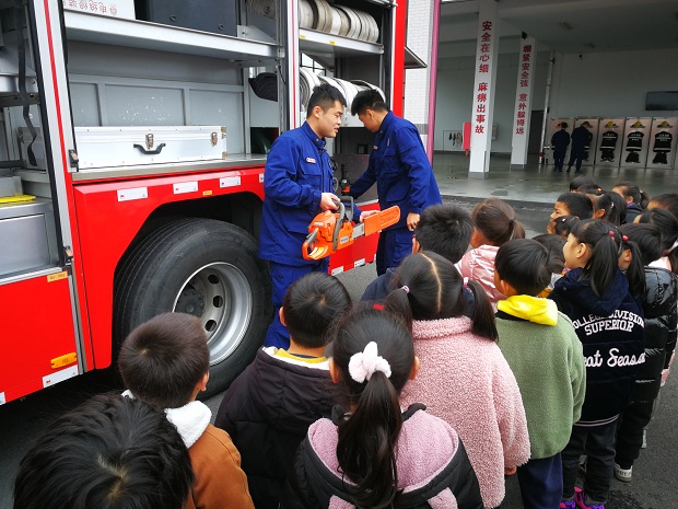 消防员叔叔用浅显易懂的语言为孩子们介绍了许多消防车上的小秘密:消防器械、高压水枪、电锯、强力切割机、防毒面罩、氧气瓶、急救箱等消防装备。消防员叔叔现场演示工具的用法,伴随着一阵轰鸣声,孩子们跳跃着,欢呼着,感受着消防员叔叔的了不起。