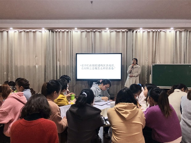 活动中,李老师首提出了问题:在组织建构区游戏前,在材料上会做什么准备,从而引出了建构游戏的组织步骤分为三步:准备材料,观察记录和反思调整。接着,李老师重点讲述了建构区游戏中观察与分析的特性。第一,是观察游戏内容的多样性;第二,是观察游戏行为与结果的发展性;第三,是观察游戏形式的自主性。最后运用建构游戏案例及本班情况相结合,进行了案例大练兵,各位老师也是就材料的使用,教师的跟进以及幼儿需要掌握哪些技能等进行了点评。