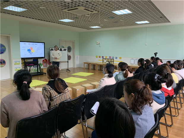 第一个活动是专题讲座,季叶洁老师分享的是《对接指南解读几何图形》,阐述了数学领域关于“数”和“形”的目标解读。认为形状和空间是幼儿几何学习的重点,并从小、中、大不同的年龄层次具体分析了3-6岁幼儿对于形状的目标,让老师们掌握数学领域关于形状的核心经验。郝卫锋老师带来的是《幼儿体育教学改革之全游戏初探》讲座,提出了“全游戏”的概念,让老师们耳目一新,进一步提升了老师们对课程游戏化的认识。