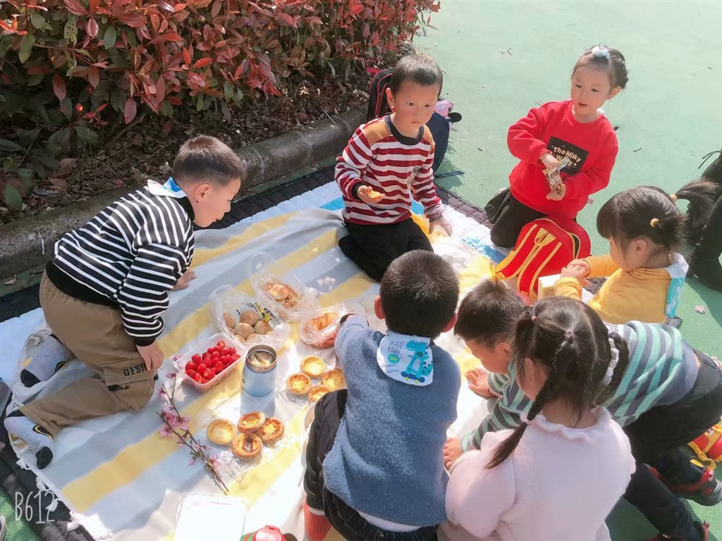 芽芽(3)班的宝宝们一路叽叽喳喳,讨论着自己看到的油菜花、桃花,还有池塘里面的小鸭子。到了目的地,与同伴一起分享自制的美食:由糖葫芦、春卷、蛋挞等等。