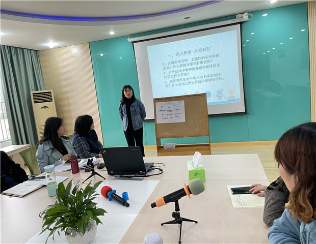 首先袁教师围绕班级区域创设的所思所想以及集体教学活动、自主盛餐中的一些问题进行了深刻的反思。接着张老师就美工区、表演区、建构区材料的投放和目的以及户外活动中孩子们材料的选择上进行了补充,针对今天遇到的问题也提出了一些自己的想法。