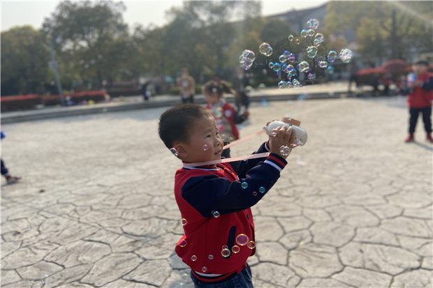 在夕阳的斜照下,孩子们个个兴奋不已!“哇,好大的泡泡,我要把它抓住!”“泡泡越飞越高,啪!泡泡不见啦,真好玩!哈哈……”瞧!中5班的蒋老师和孩子们玩起了吹泡泡的游戏,在阳光映衬下,圆鼓鼓的泡泡五彩缤纷,孩子们跳起身子有的在拍打、有的在追逐、还有的用双手托起了泡泡,泡泡下的孩子们像一个个可爱的小精灵,在嬉戏中舞动着。