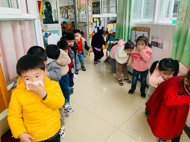 除了了解消防安全知识,我园还会不定期地组织师生们开展“火灾”疏散演练。警报声一响,各班幼儿在老师的保护下有秩序地开始撤离。孩子们用湿巾捂住口鼻、弯腰低头,按照事先预设的逃生通道紧张、有序地疏散到安全地带。