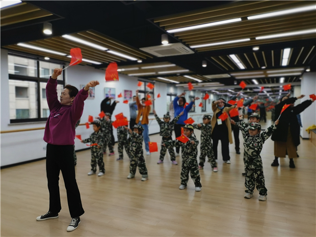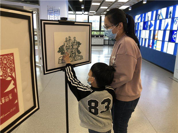 下午四点,家委会活动开始啦!看,在书苑图书区,亲子共读红色经典绘本,一幅幅精彩的画面生动地讲述着那个不平凡年代革命烈士的英勇事迹。在展厅区,家委会成员带着孩子们边欣赏着殷明欣爷爷精雕细琢的“常州三杰、钟南山、赵一曼”等人物刻纸作品,边聆听龙韵宣讲员周雁南老师深情讲述他们的英雄故事,大家纷纷竖起大拇指为殷爷爷高超的技艺点赞,也为民族英雄的付出点赞。在视听区,孩子们在主人公瑞瑞和金金的带领下开启了一段奇妙的红色记忆之旅,在感人的红军历史故事中忆苦思甜。在舞蹈房,盘龙中老年健身队的高英萍老师带领孩子们化身小红军,共跳红色经典舞蹈《闪闪的红星》。不同的活动体验,同样的教育核心,家委会成员和孩子们沉浸其中,积极感受着、参与着。