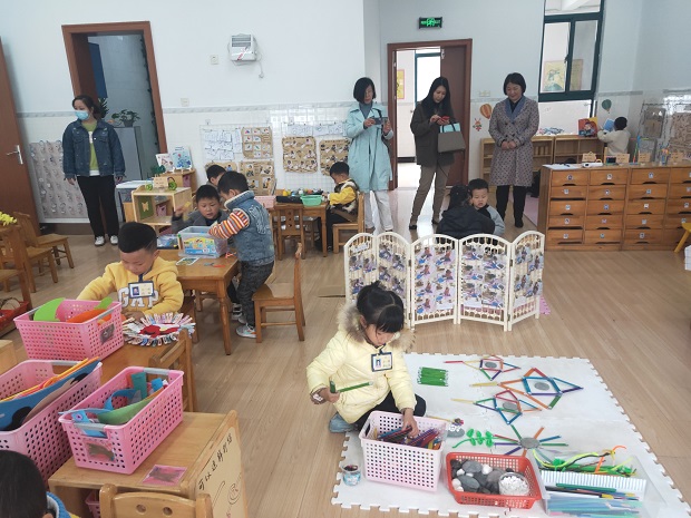 室内区域活动开始了,同行们走到各班观摩班级区域活动,欣赏着师幼一起创设的开放、多样、自主的区域活动空间;观看着墙边孩子们精彩游戏的故事、创新、问题和解决办法;观察着幼儿在游戏中的学习兴趣与探究愿望;品读着孩子们专注操作、相互合作、自主取材、及时归位的游戏品质。