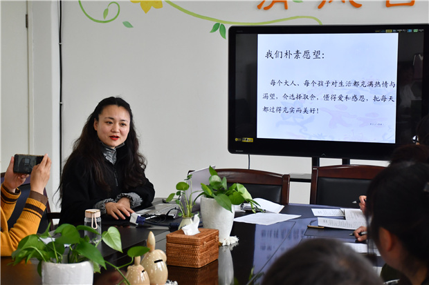 顾颖园长对各位园长的到来表示热烈的欢迎,并在百草园区会议室向各位园长详细介绍了我园的发展历程、办园宗旨、管理理念、课程建构、团队建设以及办学特色,让大家初步了解我园文化。