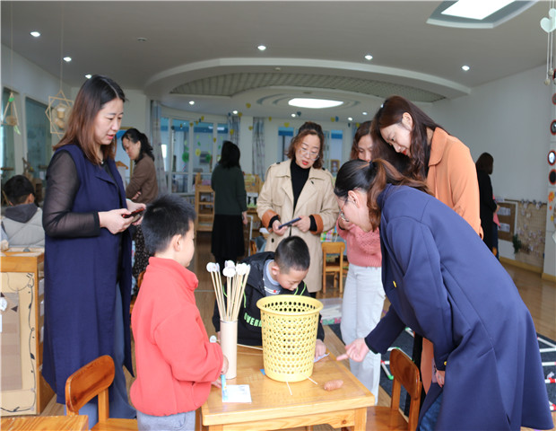 一周的时间里,跟岗团园长每天走进一个园区,参与园区、集团半日活动常规调研。大家围绕主题,结合相关评估量表,走进不同年段儿童的游戏世界。每个班级富有特色的主题环境、丰富多元的区域材料、儿童视角的班本课程,让跟岗团园长眼前一亮,频频举起手机,记录下每一个细节。在游戏活动中,孩子们高昂的游戏情绪也深恨吸引着大家,他们情不自禁地参与到幼儿游戏活动中,或询问游戏的规则玩法,或成为表演区的热情观众……真正走进儿童的游戏世界,感受童真童趣,亲身感知龙幼课程游戏化的魅力之处。而集团半日活动调研反馈,同样为跟岗团呈现了一个鲜活的课程剖析现场,让他们深刻感受到我园在课程探索中不懈向上的追求态度以及脚踏实地的做事风格。