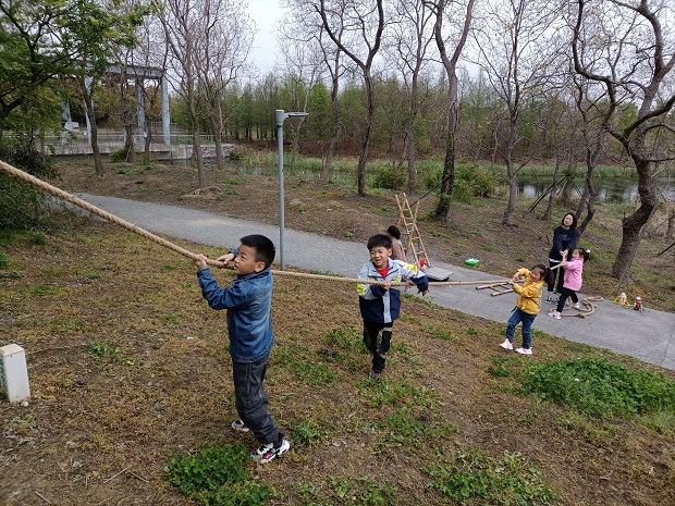 经历了刚刚合作完成的小游戏,现在要开始挑战小朋友们的力量啦!小朋友们有的与绳子融为一体慢慢往前爬,有的爬上了梯子,想要挑战最高处的绳子,有的在爬树,小朋友们把身边的大自然都变成了“玩物。”