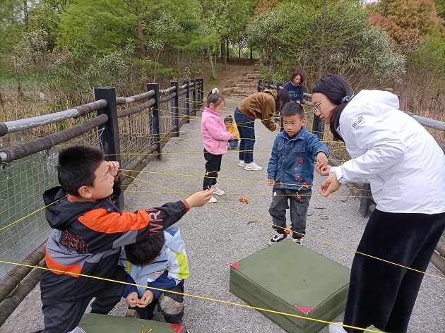 游戏结束后,在老师的带领下,大班孩子们与小班的弟弟妹妹集合,每人弟弟或妹妹做好朋友,他们手拉手一起前进,带着弟弟妹妹们走过石头桥,挑战自己。遇到难关时,能保护好弟弟妹妹,用各自不同的方式鼓励着弟弟妹妹们,毫不吝啬自己的关爱、安抚。小班的小孩们感受到了这份爱,勇敢的克服了心中的恐惧。