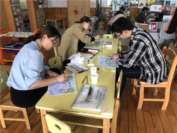 教师的构图、色彩搭配等创造性设计能力,与幼儿的艺术能力、幼儿园的环境创设息息相关。老师们围绕着“森林雨趣”这个主题奇思妙想,即兴创作,充分发挥自己的想象力和动手能力,展现自己的绘画才能,一幅幅美丽的图画跃然纸上,充分展示了教师们良好的绘画功底。