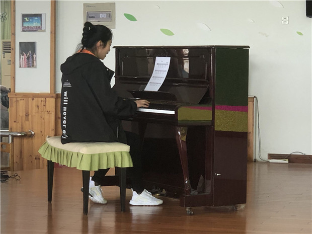 弹唱是幼儿园教师必备的基本功,本次弹唱教师在规定的五线谱曲目中抽签,经5分钟准备后现场弹唱。要求旋律准确,歌唱流畅、弹唱和谐,具有一定的音乐表现力与感染力。现场,一个个跳动的音符,在老师们灵巧的指尖下翩翩起舞;一曲曲动听的旋律,在耳畔萦绕徘徊。