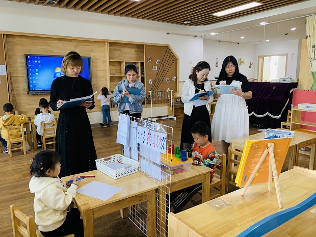 在区域活动时间,行为观察组的老师集中观摩了苗苗(3)班区域游戏活动现场。苗苗(3)的教师根据幼儿的年龄特点、活动主题及幼儿兴趣爱好,精心设计、巧妙布局,尤其是班级的科探区,教师前期做了充分的准备工作,涉及主题游戏、绘本游戏等多个游戏内容。幼儿在游戏中,专注地与材料互动和探索,主动地进行表征和记录。游戏结束后,班级老师还根据游戏情况,进行有效的分享交流活动,促进游戏向更高水平发展。