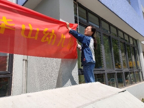 这是孩子们在幼儿园参加的最后一次运动会,老师们一早就来到幼儿园布置会场: