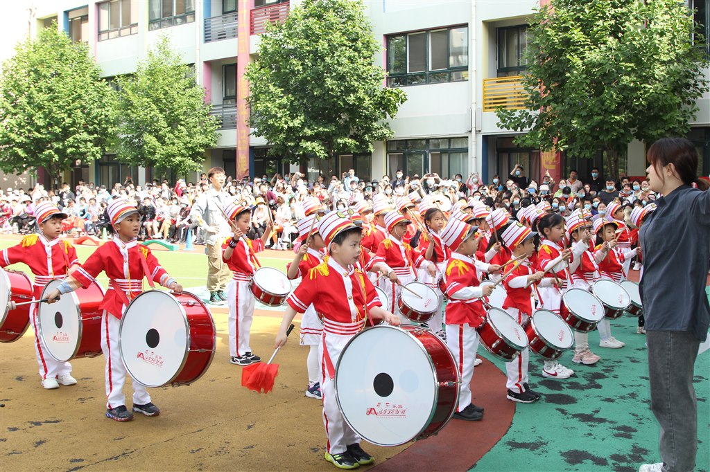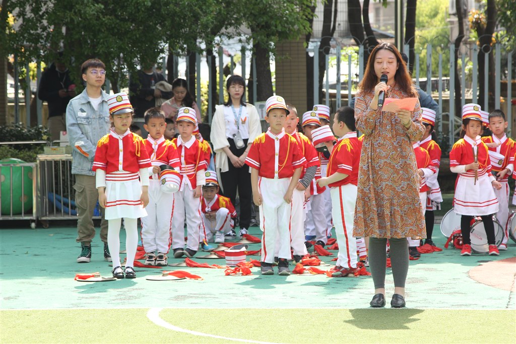 接下来是庄严的升旗仪式,小小护旗手们步履铿锵,大步向前,鲜艳的五星红旗在大家的注目下徐徐升起,升旗后鼓号队哥哥姐姐们带来了气势威武的表演,阵阵鼓声好像在给小班弟弟妹妹加油助威。