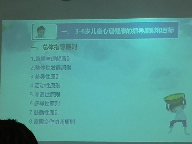 吴老师从3~6岁儿童心理健康的标准、指导原则、影响因素和行为问题的防治四个方面展开了干货满满的讲座。他提出3-6岁是幼儿心理发展、成长和人格形成的关键时期,大力开展幼儿心理健康教育,增强幼儿的心理素质,提高幼儿的心理健康水平是幼儿园、家庭和社会需解决的重大课题。为了帮助幼儿更好的认识调节自己的情绪,拥有快乐的心情和健康阳光的良好性格,教师应该遵循尊重、多样差异和积极引导的辅导原则,面对不同家庭环境和人际环境下成长的儿童给予对应所需的心理引导。