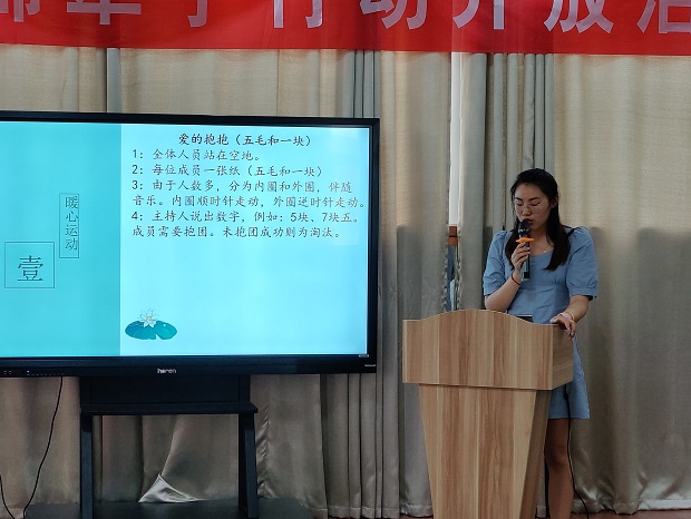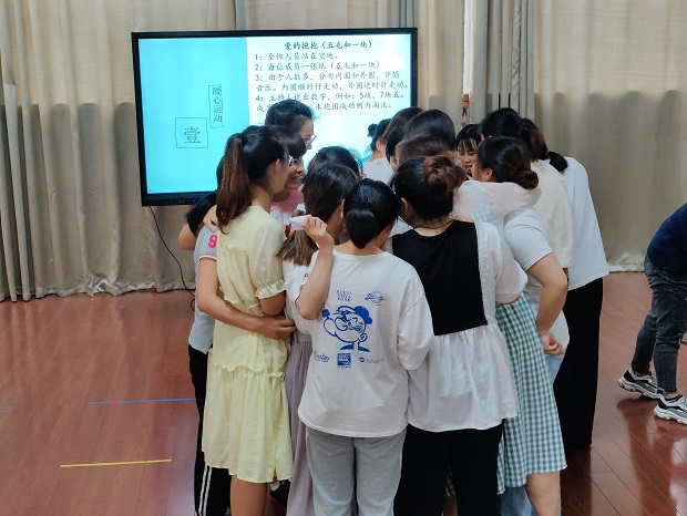 首先第一个活动是暖心游戏——“爱的抱抱”。老师们抽取一张纸(五毛和一块),站成内圈外圈进行游戏,按照相应的金额指令相互抱成团。游戏的进行,拉近了教师们的距离,活动的氛围也瞬间点燃。
