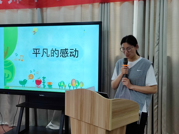 接下来,严茜茜、曹榆梵、祁洁、徐银四位老师给我们带来了动人的故事分享!严老师的《有一种爱叫守护》,讲述了最美保安的暖心坚守,爱岗敬业;曹老师的《新美教师 汇聚一方》,从开学环创出发,完美的诠释了团结就是力量,只要思想不滑坡办法总比困难多;祁老师用《不一样的孩子,不一样的爱》告诉我们:每个孩子在教师眼中都是一本截然不同的书,中班的老师、保育老师们也都用眼光、用心灵、用双手、用爱心去解析着孩子的心;徐老师的《平凡的感动》,向我们展示了苏磊老师,冯亚丽老师的带班日常,平凡而又感动。