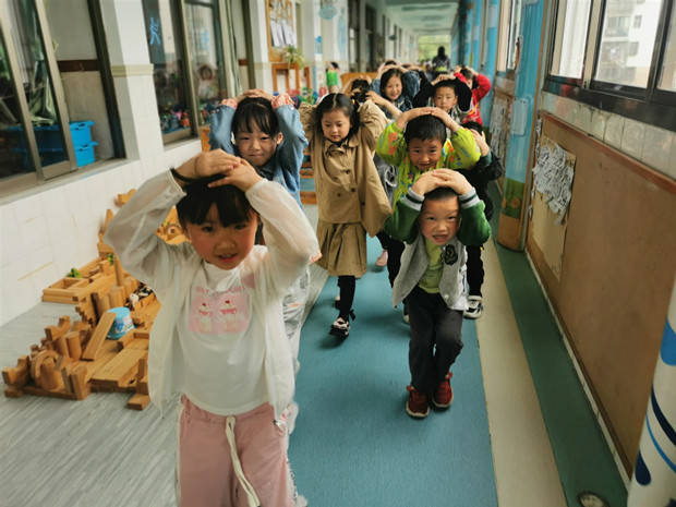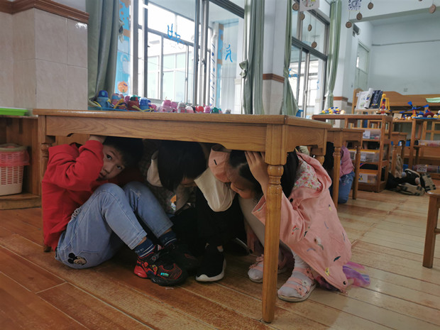 随着警报响起,老师们立刻带领孩子们停止了活动,以最快速度找到最近的安全地带进行避险自救。老师们一边引导还在们躲避危险,一边引导他们用正确的姿势躲藏:双手抱头,将身子藏起。