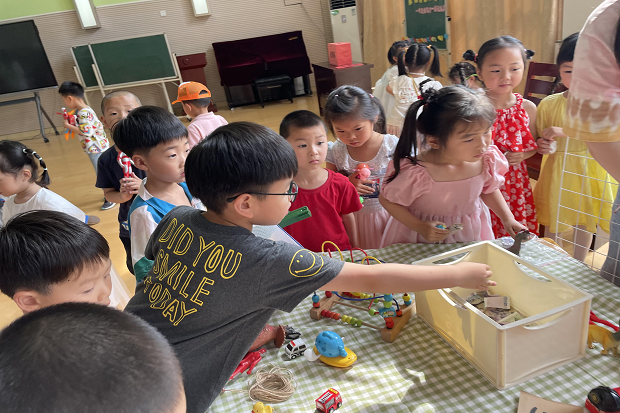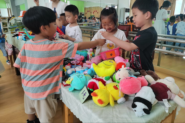 活动前期,中班组的每个孩子都从家里带来了干净、安全的旧玩具、图书、作品等,为此,我们尝试义卖计划:我想带什么玩具来、我们的玩具该怎么整理、玩具店名叫什么、怎么推销我们的商品、价格定多少等。