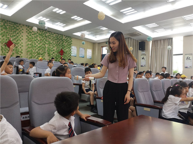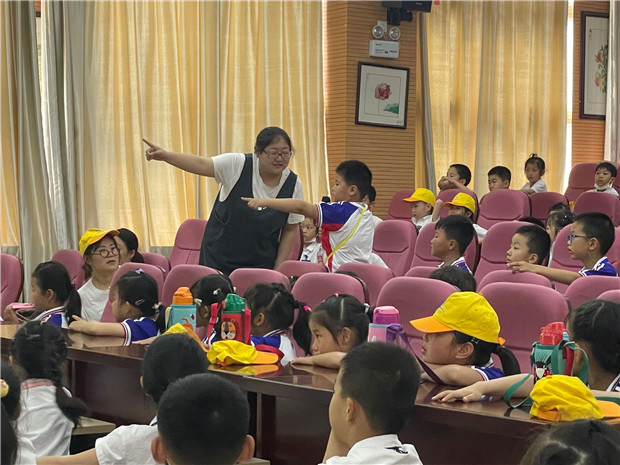 河幼娃头戴小黄帽,只见黄澄澄的一片小黄帽进入了香槟湖小学校园,孩子们好奇地睁大眼睛观望着陌生又向往的小学,小伙伴兴奋的小声交流着。随着《运动进行曲》的响起,孩子们整齐的排好队伍来到了大操场,参与了香槟湖小学的升旗仪式,脱帽行注目礼,一起唱国歌,听着小主持人介绍端午的习俗,结束后还有一年级的小哥哥小姐姐一起参加了大课间活动,大手牵小手玩得不亦乐乎。大课间结束后香槟湖小学的黄恬恬老师、诸葛倩老师和一年级的同学们给小朋友们带来了两节有趣的语文展示活动《胆小鬼威利》《乱七八糟的魔女之城》,孩子们认真的倾听着,时不时放声大笑,时不时和老师互动起来,积极参与很有小学生的样子哦。课堂观摩结束后香槟湖小学的三位小小讲解员带着河幼的娃娃们分组参观了香槟湖校园的科学长廊-操场-乐高墙-攀岩墙--教室-果蔬园-图书馆,最后孩子们在小学里合影留念。