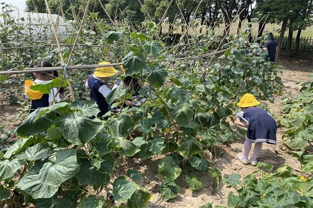 品尝完美味的蔬菜瓜果后,幼儿遇到了正在辛勤农作的爷爷,他们个个叽叽喳喳地问:“爷爷,我们种的番茄要什么时候才能变红呢?”有的孩子大胆猜测是不是这个泥土跟学校的不一样呀?这里的植物长得特别旺盛!爷爷也把好的种植经验分享给孩子们。