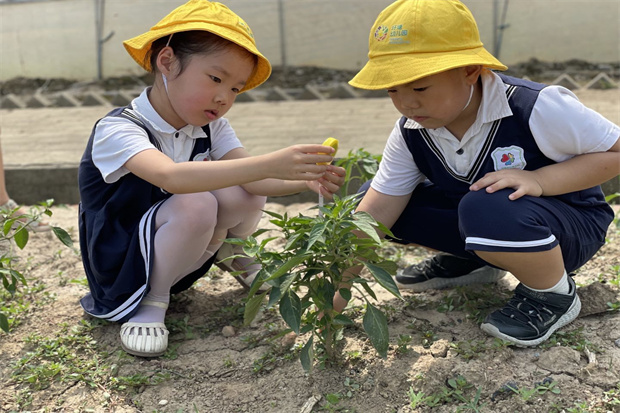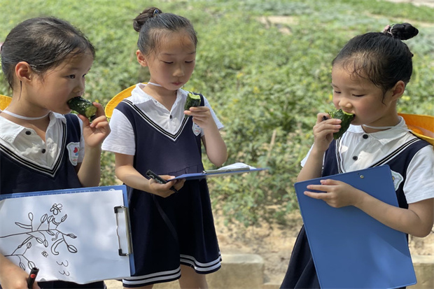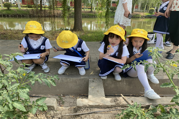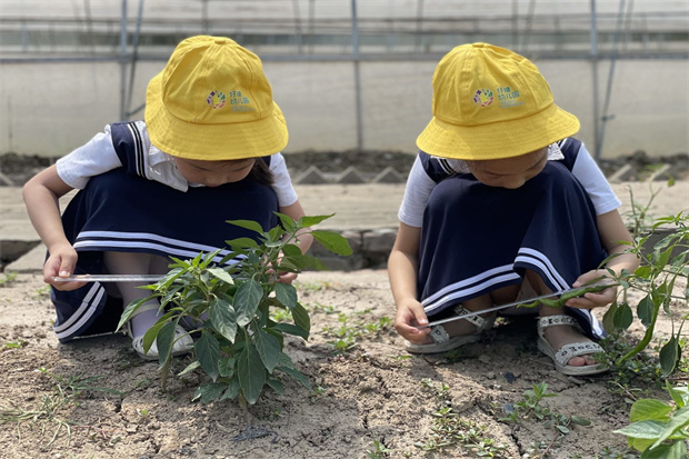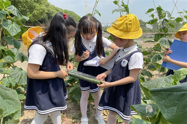 在和煦的阳光下,孩子们一下子被眼前的景色所吸引住,小小的辣椒,红红的小番茄,大大的茄子,还有一根根可爱的小黄瓜,孩子们飞奔了过去,来到了种植园中,有的拿着尺,有的拿着回形针,有的拿着绳子,在对瓜果蔬菜进行测量,有的孩子主动拿起画板将植物的点滴变化勾勒在画纸上,每个孩子都乐在其中。