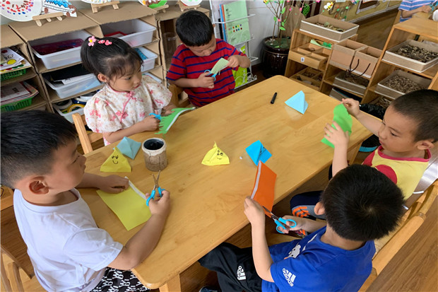 大班的小朋友在干嘛呢?瞧!孩子们纷纷拿起了剪刀和画笔,剪剪贴贴,一个个形态各异的粽子宝宝诞生啦!“我的粽子是蛋黄的”,“我的是豆沙的”,“我喜欢甜枣的”……谈笑间,浓情蜜意暖人心!