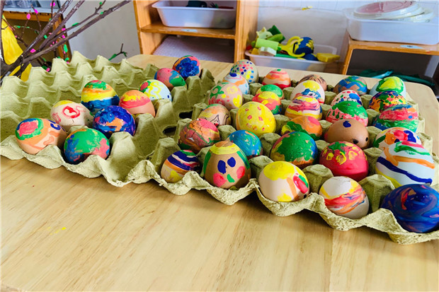 中班的小朋友将一个个小鸡蛋加上五彩的颜色,画上不同的图案,变成了一个彩蛋,可真漂亮呀!将画好的彩蛋送给好朋友,互祝一句“端午安康”,每个孩子都在用自己的方式表达着对朋友的祝福。