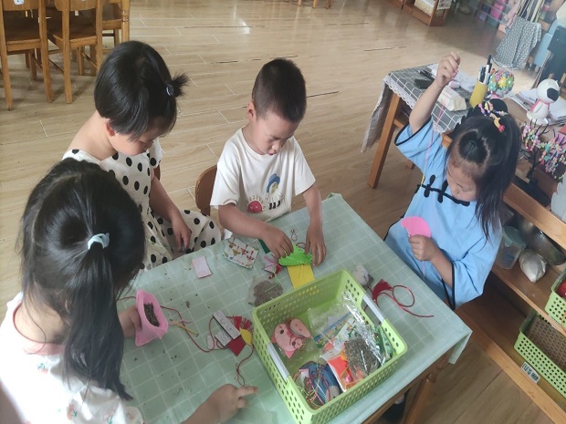 佩香囊,是端午传统习俗之一,香囊内通常填充一些具有芳香开窍的中草药,有清香、驱虫、避瘟、防病的功效。中班的孩子们通过制作香包的方式来感受浓浓的端午情。