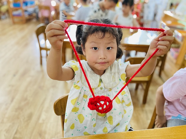 五彩绳,是吉祥的象征,在古代也叫作长命缕,在端午节亦有佩戴五彩绳的习俗。孩子们从自己家里收集了各种各样的五彩绳,一起跟着老师编织、缠绕,寄托着美好祝福,祝愿孩子们健康成长。