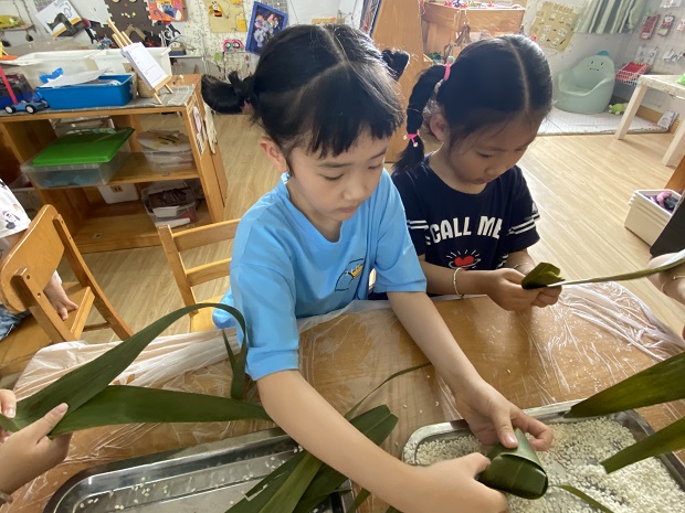 “淡淡棕叶香,浓浓世间情,根根丝线连,切切情意牵。”孩子们小手拿着粽叶,一折叶,二盛米,三压实,四包紧,五扎绳……每个粽子里面都有一句节日的甜甜话。孩子们在包粽子的过程中既体会了劳动所带来的成就感,又深刻感受到了端午节浓郁的文化气息。