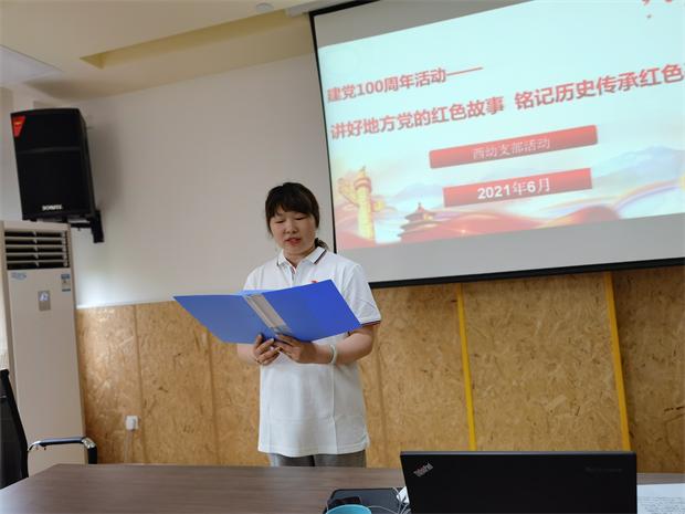 在庄严又雄伟的国歌声中,活动开始了。首先,由支部书记孙步英讲中共常州地方党组织的故事。从1926年最早建立的中共横山桥支部到全市各党组织的陆续建立,是历史的必然,更是常州人民追求光明、追求真理的必然。接着,同志们一起聆听支部委员陈丽丽讲地方战役——陈巷桥伏击战。1939年9月8日晚震惊中外的陈巷桥伏击战不仅狠狠地打击了日军的嚣张气焰,还大大地振奋了群众抗日信心,这场战役意义远大,位于该战斗发生地附近的乡村如今也是建设地如此美好。党员代表高丽艳怀着崇敬和沉痛之情为大家讲述了一位西夏墅的革命烈士张鹏云的英雄事迹。张鹏云自加入中国共产党后,不畏前险,英勇除奸,不幸在抗敌中被乱枪击中,壮烈地牺牲在了他的28岁。无数像张鹏云一样的有志中华儿女,用血肉身躯浇筑成了如今我们坚实的城墙,用宝贵的生命奉献给了祖国和人民,英雄们永垂不朽!接下来,青年党员张丽军同志带来了《红色精神伴我行》的演讲,从小熟悉吟唱的《打靶归来》《歌唱二小放牛郎》等红色歌曲影响了青年一代的同志们,共产党人的先进事迹代代相传。在聆听了这些党史与红色故事后,西幼党员们怀着激动和崇高的爱国之情用嘹亮的歌声集体演唱了《我爱你 中国》这首歌,并且大声地宣读了入党誓词。最后,以一首《国际歌》结束了此次党员活动。