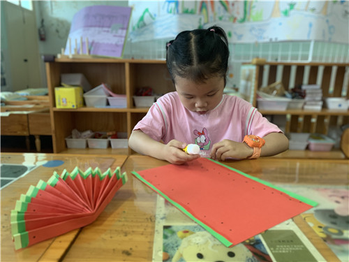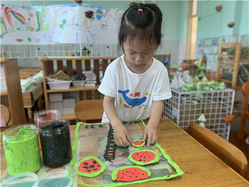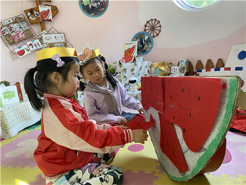 夏天少不了的就是西瓜啦!孩子们在阅读绘本《蚂蚁和西瓜》之后,对西瓜产生了浓厚的兴趣。于是,“西瓜大作战”的主题性游戏开始啦!有的小朋友用超轻黏土制作西瓜,有的小朋友用水彩笔进行彩绘西瓜,还有的小朋友在阅读区中表演起西瓜的故事。在这个过程中,小朋友们的想象力和艺术表达能力得到了锻炼。