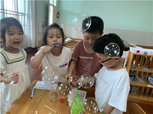 吹泡泡是孩子们最喜欢的游戏之一,无论是小班的幼儿,还是中、大班的幼儿。在生活中,我们经常看到孩子们在户外玩吹泡泡的游戏。当中班的幼儿看到小班的弟弟、妹妹们在玩吹泡泡的游戏时。他们也想玩玩一玩。基于中班幼儿的能力发展水平,光是吹泡泡对他们来说真的是“小菜一碟”。那么,如何玩出新高度呢?活动前,老师带领孩子们一起讨论。吹泡泡需要哪些工具?这些工具怎么获取?经过孩子们的一番商量,孩子们决定自己制作泡泡水。于是一场关于吹泡泡的主题性游戏如火如荼地开展起来啦!在制作泡泡水这个过程中,孩子们商量讨论、实验对比、观察记录,最终成功制作出泡泡水,享受吹泡泡成果的乐趣。这一系列的活动中,我们看到了孩子们聚精会神研究的神态,看到了孩子们自由自主的状态,看到了孩子们获取成果的喜悦精神!