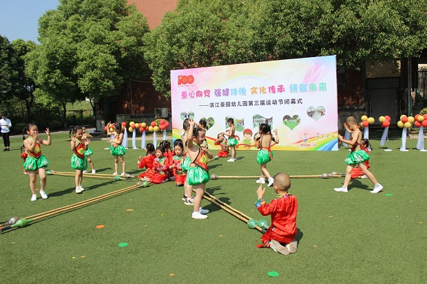 “花样跳绳”、“竹竿舞”呢?瞧!豪幼娃正踩着音乐的节拍,自信快乐地展示着这一了不起的本领呢!精彩之处,现场掌声雷动。豪幼的教师团队更是为观众们展示了“花样跳皮筋”。娴熟的步法与默契的配合,展示了豪幼教师积极向上的团队风貌。在欢乐气氛的带动下,观众们上场和孩子们一起尽情玩耍,豪幼的户外场地顿时幻化成欢乐的民间游戏海洋,大家一起感受运动的快乐,享受民游的乐趣,中国传统文化在这里代代相传。