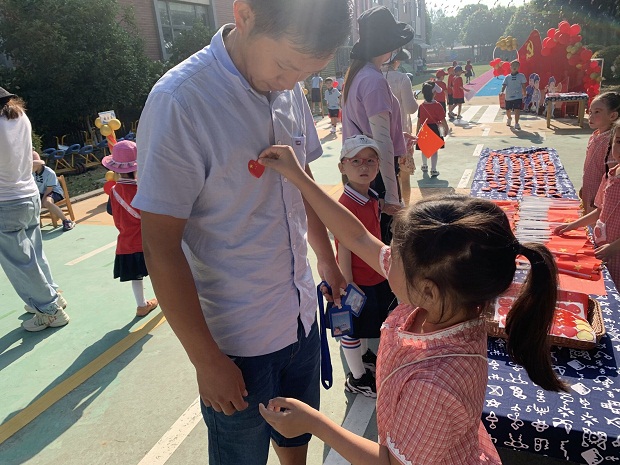 充满时代印记的老物件,是对过去艰苦岁月的怀念。充盈童年趣味的民间游戏,是孩童时光最美好的回忆。今天,幼儿园里每一个创意有爱的细节,都是豪幼人最质朴纯真的心意。签到留影区,大家留下爱党爱国的印记。民游展示区,大家有的驻足观赏,有的更是亲身参与体验一把儿时的欢乐。温情涌动的现场绽放颗颗炙热的爱国之心。
