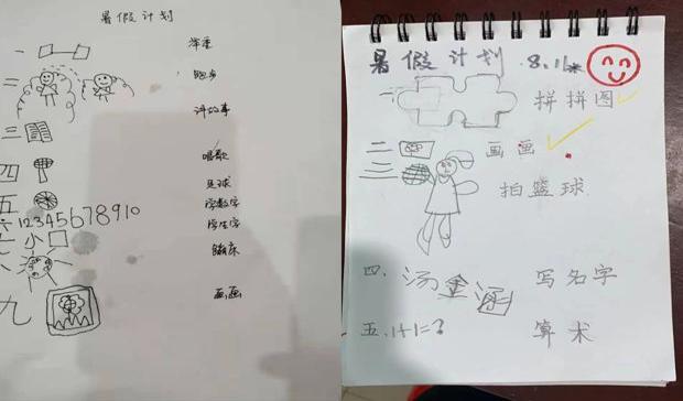 孩子们以绘画的形式制定一日作息,自制打卡表,养成每天按时睡觉和起床的好习惯。利用早晨、傍晚时候进行连续拍球、跳绳的练习,一天运动时间达到2小时。在父母的引导下尝试书写自己的姓名、学号,学会正确书写自己的名字,写画时姿势正确。