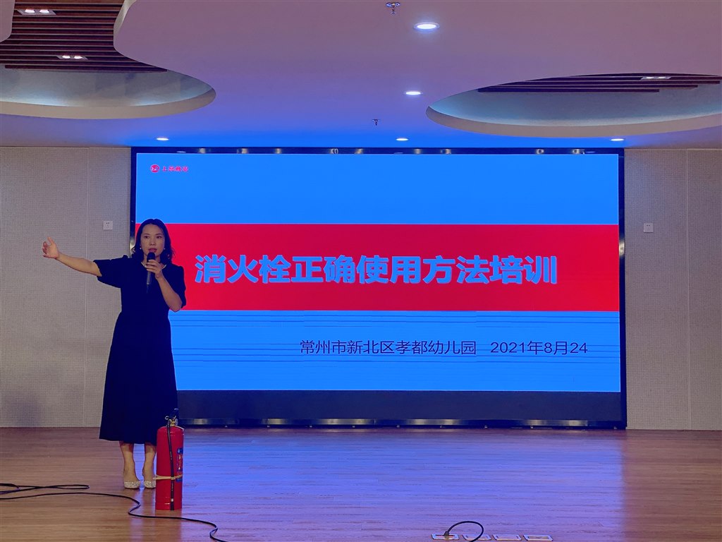 为了加强幼儿园消防安全工作,提高教职工使用灭火器、消防栓的能力,2021年8月24日上午,常州市新北区孝都幼儿园总务主任胡清丽老师,组织全体教职工对消防栓灭火器的使用开展了主题为“关注消防 珍爱生命”的安全专题培训。