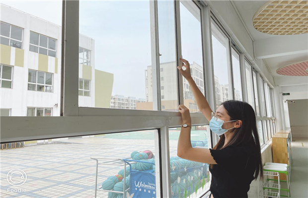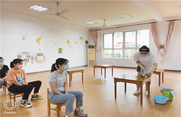保育老师穿好防护服,带好一次性手套、口罩等,对教室呕吐物进行清理,再次对教室环境进行臭氧消毒半小时。
