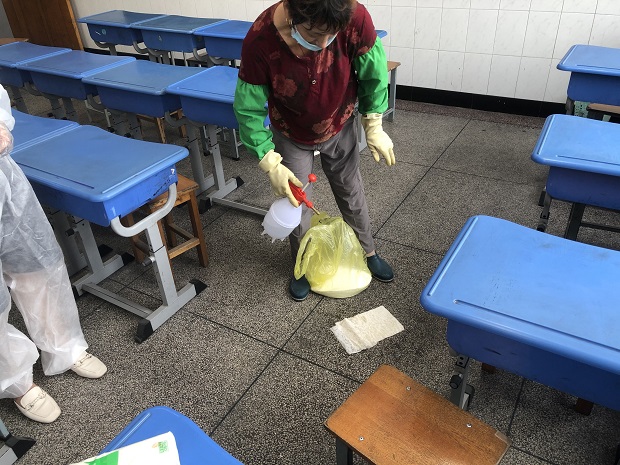 疫情防疫组做好个人防护,使用水银温度计复测2次体温,间隔不少于10分钟。对于复测体温仍大于等于37.3℃,疫情防疫组登记学生信息,再次排查其流行病学暴露史。在班内的任课老师逐个为学生测温并带领学生转移到隔离教室。消毒组队班级和学生活动的路径进行全面消毒。