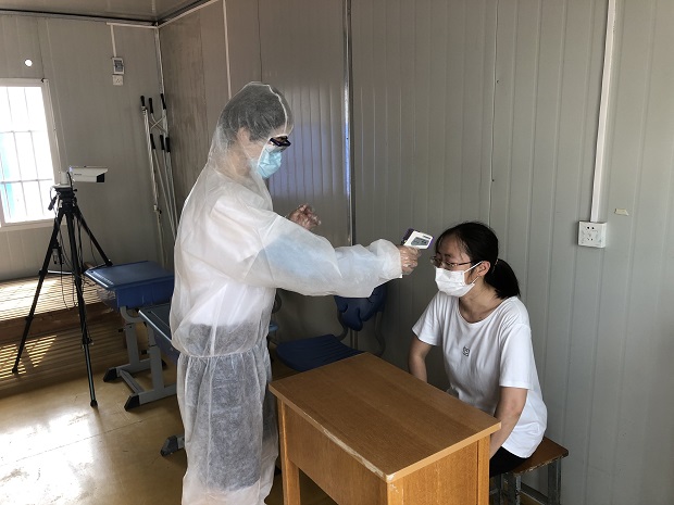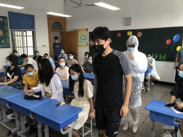 在讲课时,学生出现身体不适,老师及时了解学生情况,测量体温,发现有发热症状,将学生带到室外复测,立即打电话通知班主任和戴謇老师。戴謇老师接到电话第一时间提醒学生佩戴好防护口罩并引导其进入隔离室。