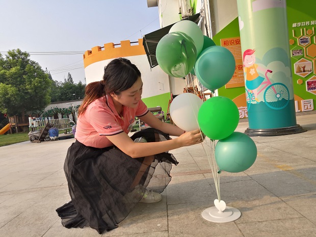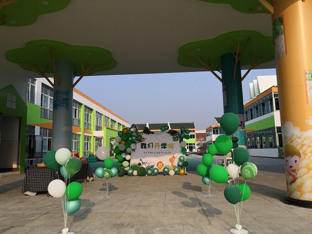 为了给孩子们打造温馨的开学环境,营造家的氛围,教师们一大早就到校忙活起来。大家齐心协力将桌椅、背景墙、气球等搬至大厅,根据大班年级组长沈婷月老师昨天的分工,大家有序合作,不一会,温馨的大厅环境布置好了:大气的背景墙与大厅色调相吻合,两旁的气球傲然挺立,仿佛在期盼着萌娃们的到来,南边一排是老师们为孩子准备的预示着聪明伶俐、大吉大利等期盼的实物,进园通道两旁,还有童话人物打扮的老师和大班幼儿在等待着开园,一切准备就绪,就等你们的到来!