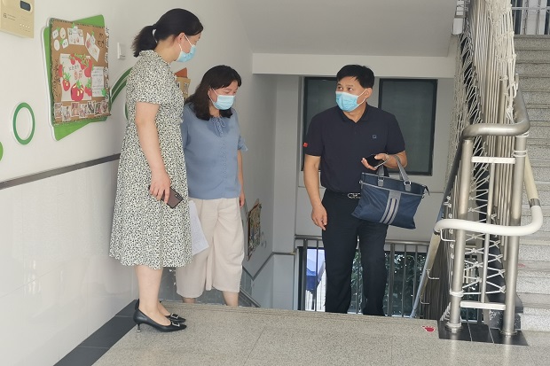 2021年9月1日新学期开学日,上午9点新北区教育局顾建伟校长来到孟河实验幼儿园,在恽春燕园长的陪同下进行跑面指导工作。