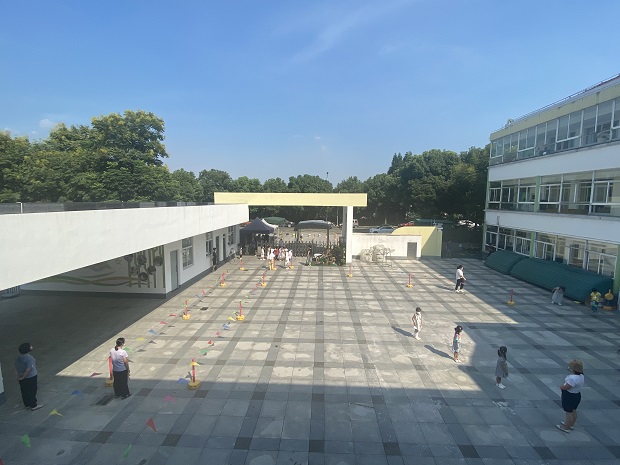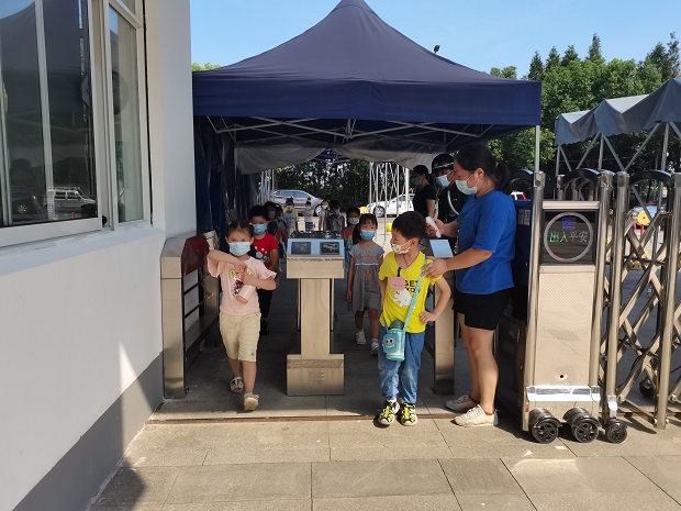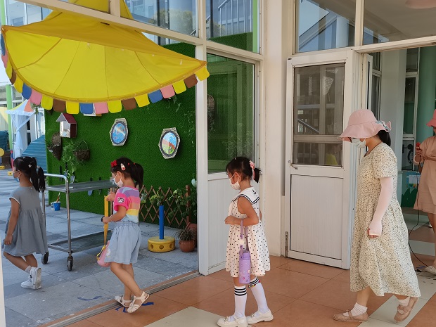 按照来园路线,实行分时间段离学。由两位老师带班进入四个通道送幼儿至园门口,保育员老师打扫班级卫生。家长在园门口安排要求排在相应的通道中接幼儿。
