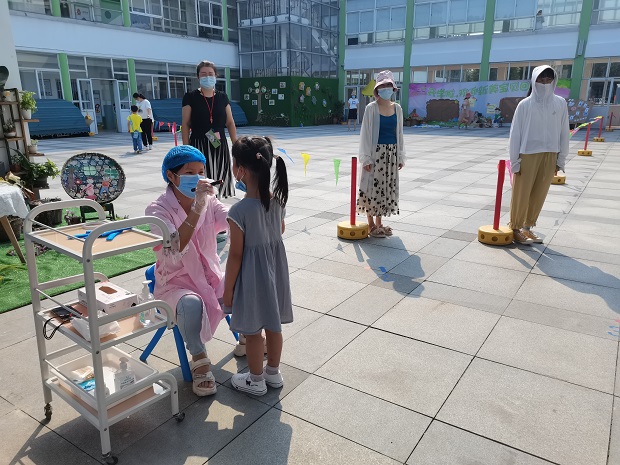 演练活动前学校门口拉好警戒线,在地上每隔1.5米做标记,幼儿戴好口罩,并保持1.5米左右间距,分两条通道排队进入学校,通过手动耳温枪、红外线体温仪进行体温。入园后,中大班的幼儿由一名班主任和保育员在每班通道处迎接幼儿,小班的幼儿则和大班幼儿携手,在老师的带领下有序入园。