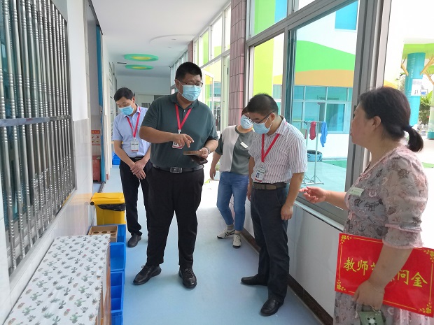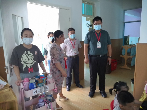 在张小红园长的带领下,巢主任等领导察看了校园环境,在听取张园长对于校园大环境色调的选配、大厅环境改造理念等的解说下,巢主任等领导对于安家幼儿园暑期大环境的改造成效给与了肯定,赞赏了张园长的设计理念。随后听取了张园长对于开学工作的汇报,了解了安幼有条不紊的开学工作。随后走进小班教室,去看一下刚入园新生幼儿的在园状态,看到小班孩子有序的如厕、喝水、参与集体活动,领导们再一次肯定了我们的开学工作,并向在九月这个繁忙的开学季术有专攻、不怕辛苦的教师们致以节日的问候和美好的祝福。