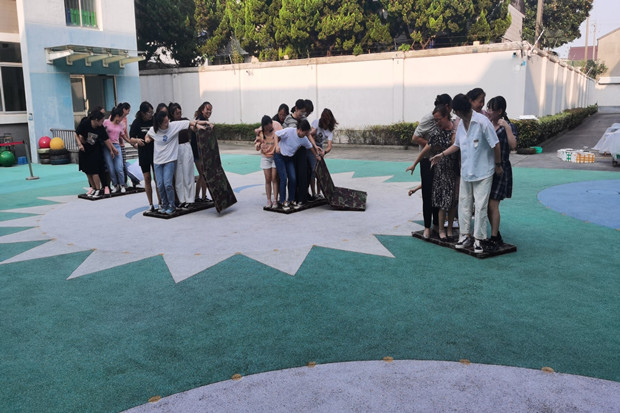 所有教职工等分为若干小组,6-8名教职工为一组,每组两张迷彩垫作“舟”,竞速过“河”,用时最少组胜。