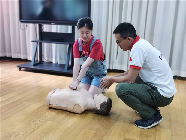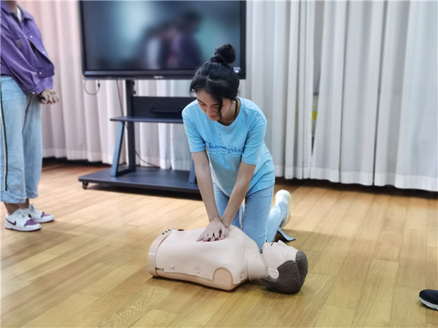 本次培训从扭摔伤、骨折等基本救护知识出发,强调了救护者较强的心理素质。聚焦心肺复苏的操作,心肺复苏术简称CPR,是针对骤停的心脏和呼吸采取的救命技术,比如胸外按压的姿势,开放气道等。随后,老师们进行了现场操作和学习。