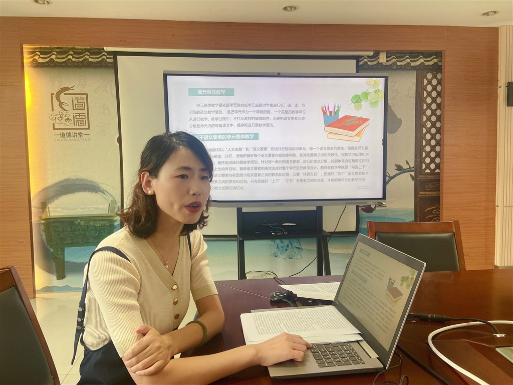 活动中,成长营领衔人曹燕老师进行了《基于语文要素的单元整体教学》的专题讲座。曹老师从统编版教材的变革出发,阐述了基于语文要素的单元整体教学研究的必要性,接着,她从“瞻前顾后,确定要素能级”、“细读文本,找到语言密码”、“设计活动,指向言语实践”、“运用评价,促进分层发展”四个方面呈现落实单元语文要素的策略。讲座中,曹老师以“想象”单元为主要切入口,以二年级下册第七单元、三年级上册第四单元为例,研究课例为重要载体向老师们更直观地展现要素的落实和推进。她表示,基于语文要素的单元整体教学研究,让学生能力的提升有策略、成系统,最终会进一步提升学生的学科素养。
